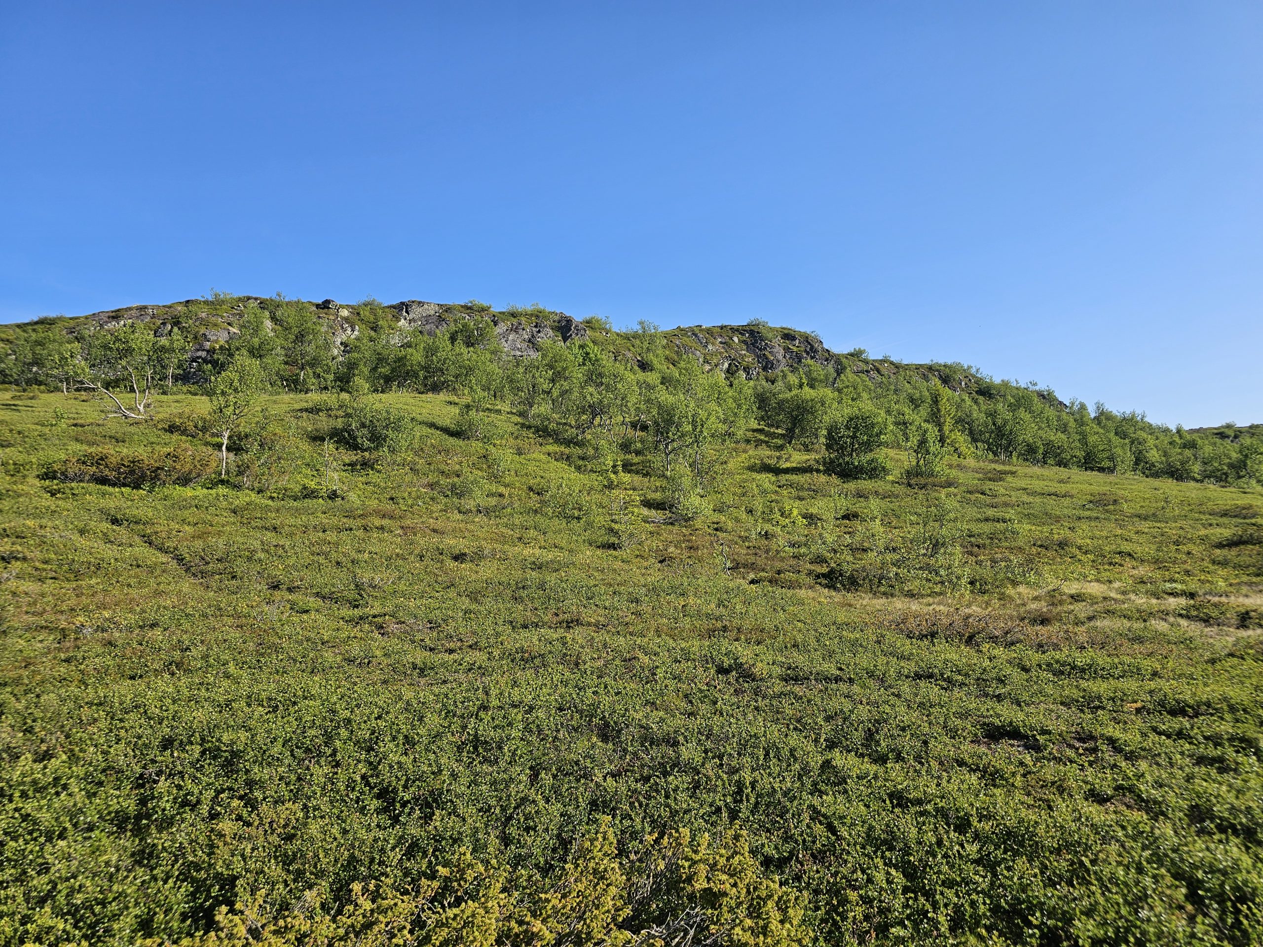 Gemensamt hittade vi bästa vägen över myren, och vi kom faktiskt torrskodda över. Snart gick vi ivrigt uppåt på hed bevuxen med ljungris och dvärgbjörk, mot punkten vi siktade på.