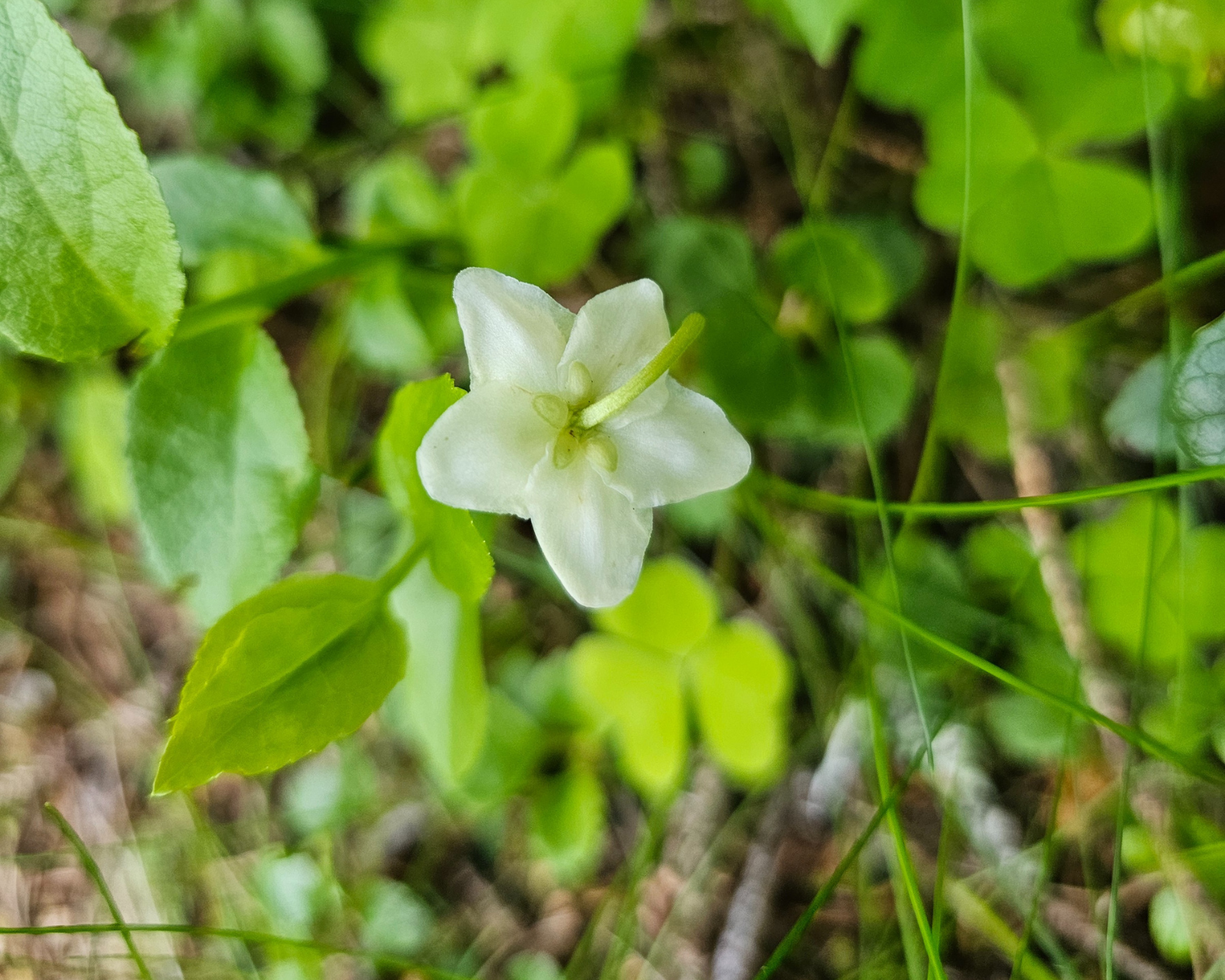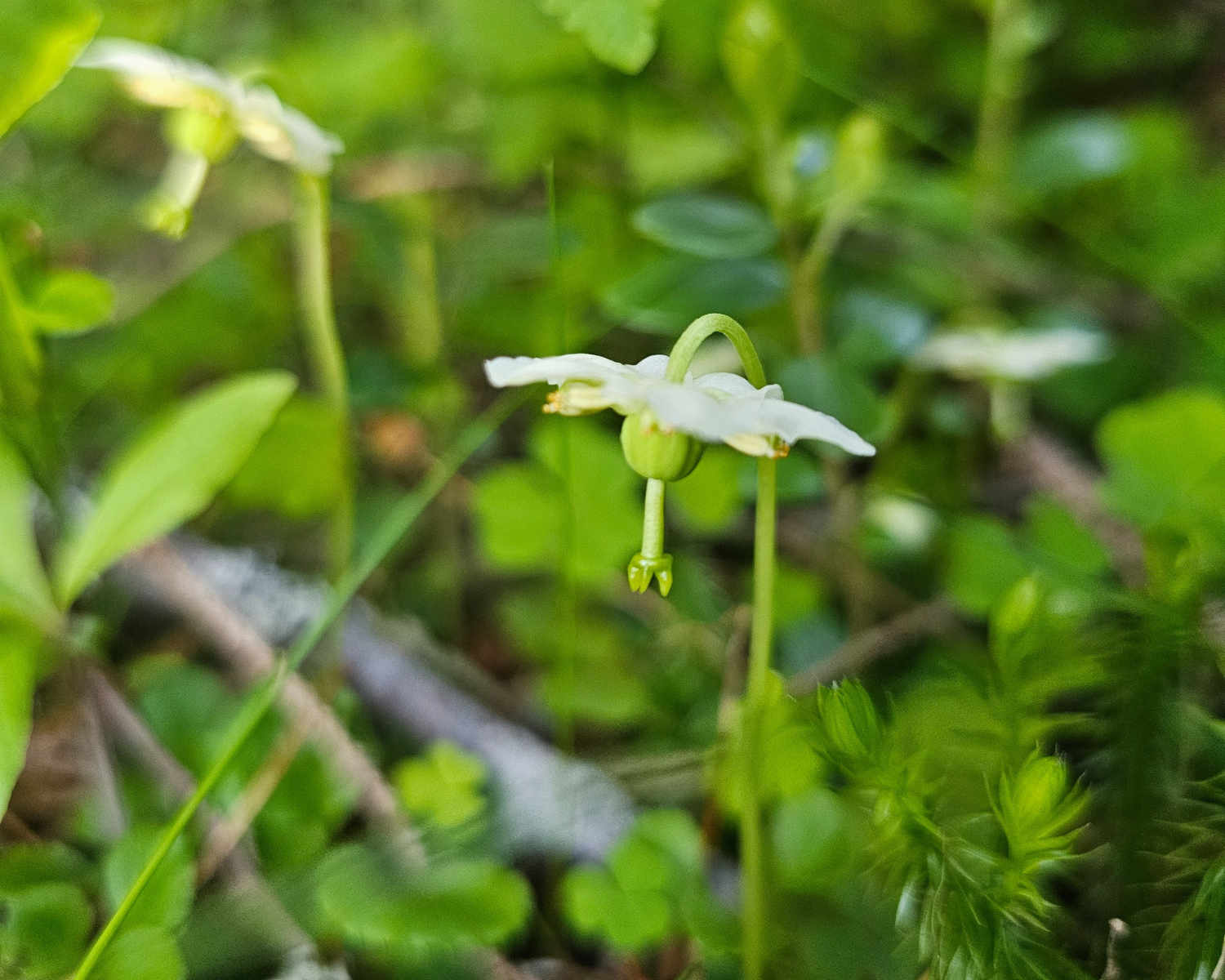 Här var växtligheten enorm och midsommarblomster trängdes med vitsippsranunkel, smörblommor och fläcknycklar. Till min stora lycka lyckades jag även se några ögonpyrola (Moneses uniflora) – vilket var premiär för mig. Men växtplatsen var helt rätt – äldre mossrik granskog!