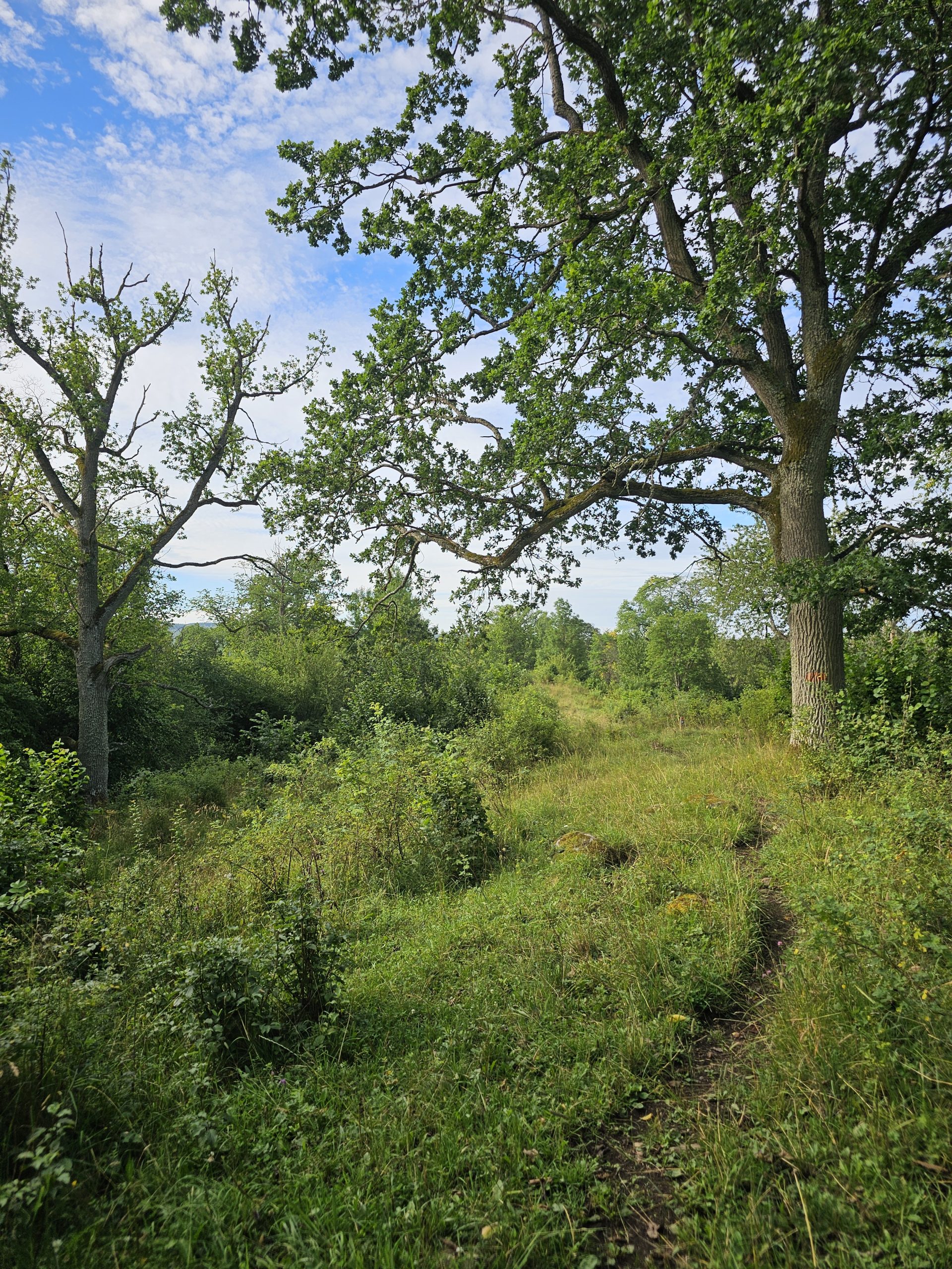 Precis innan jag hade passerat vägen såg jag kyrktornet i Varnhem till vänster – men leden svänger istället av åt höger. Man följer en liten stig i Ökull-Borregårdens naturreservat och gör en yvig sväng innan leden åter vänder mot Varnhem.