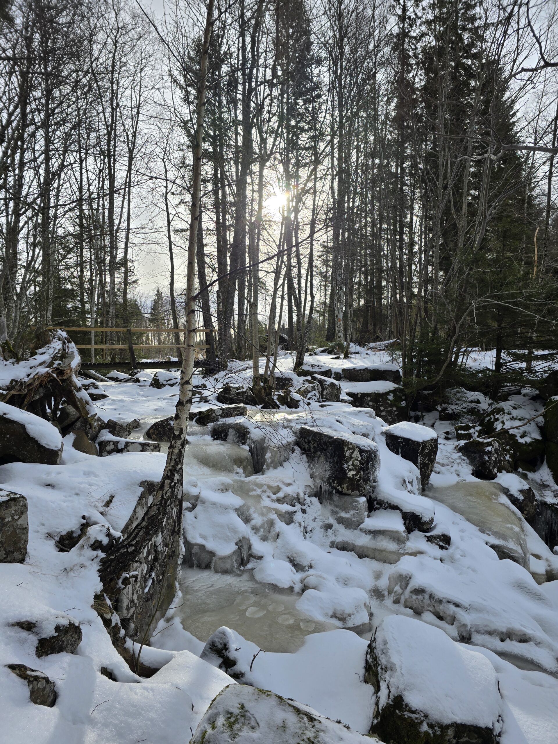 Från kyrkan följde vi bilvägen upp mot berget några hundra meter innan vi svängde in på den orange markerade stigen mot Jättadalen och Öglunda grotta. Hundarna var lika förväntansfulla som jag och gick ivrigt framför mig i den orörda snön. Vi passerade offerkällan och följde den isbelagda bäcken, där vattnet anades under det frusna täcket.