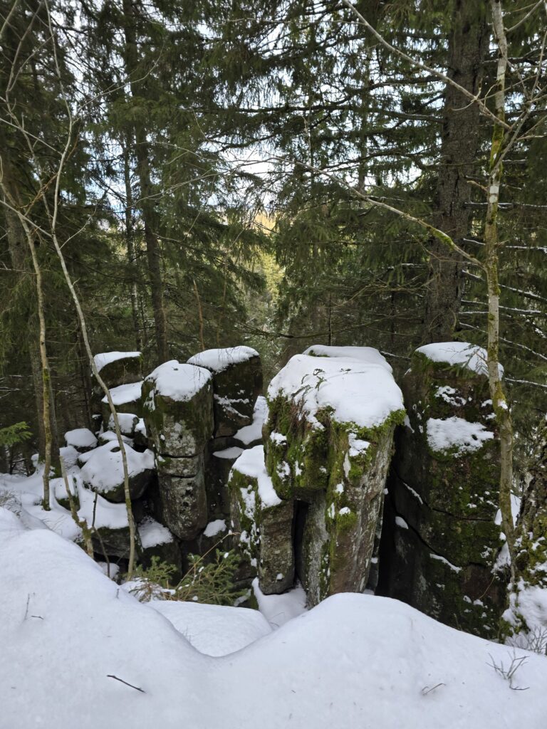 Uppe på höjden gick vi över bron över den frusna bäcken och svängde ut till bänken vid utsiktsplatsen. Hundarna hade dock ingen ro att stanna. Jag tycker mycket om den här platsen med sina mäktiga diabaspelare. Nu doldes de delvis av snön, men jag visste ju ändå att de stod där.