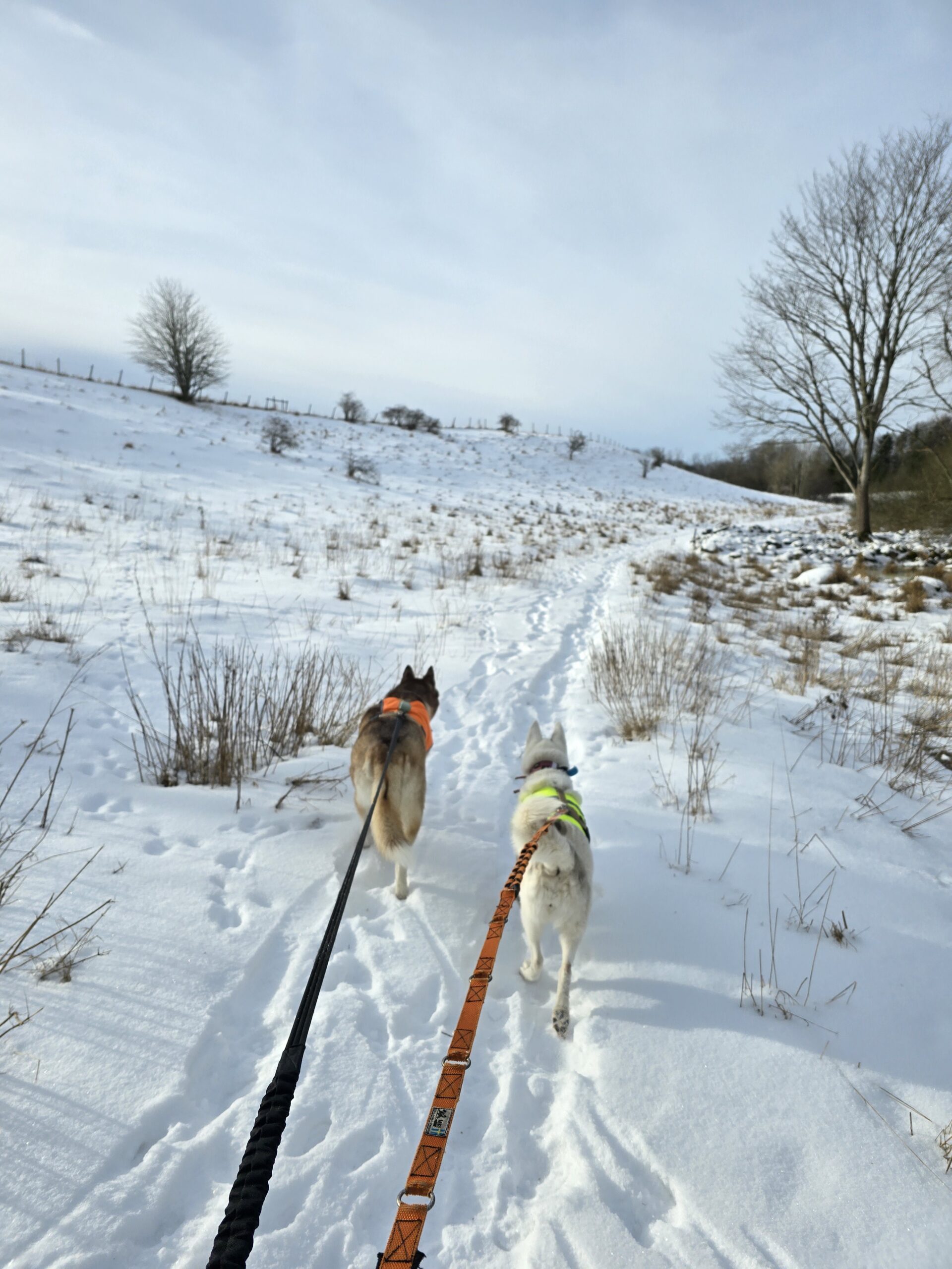 Hundarna gick med lätta steg över åsarna och jag följde efter så gott jag kunde. Förra gången jag gick här var kullarna mjukt gröna och körsbärsträden på väg att slå ut. Nu låg samma landskap stilla under snön. Ändå kände jag igen varje sväng på stigen, varje gård vi passerade och sjön med alkärret som skymtar mellan träden.