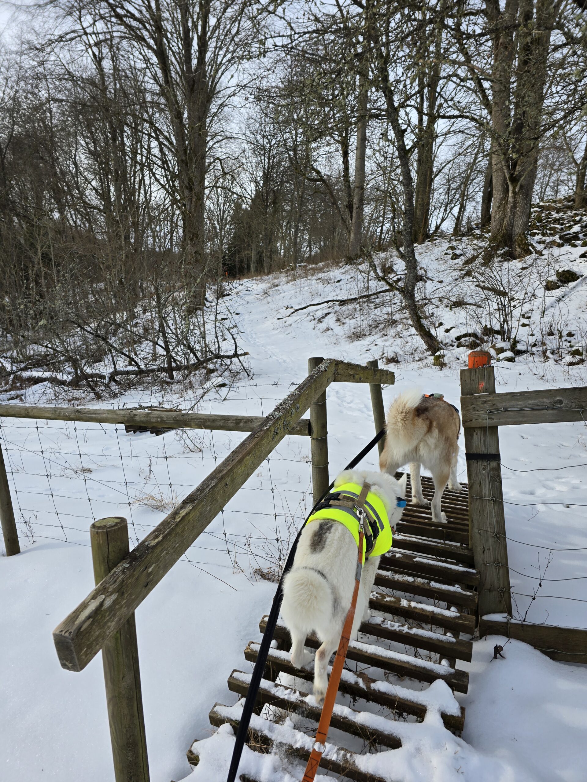 Samtidigt fanns det två saker som krävde lite extra uppmärksamhet. Mellan hagarna finns inga grindar utan stättor, vilket betyder att hundarna behöver klättra varje gång. Teddy är van, men Svea tyckte det var lite obehagligt, och båda två halkade ner mellan pinnarna några gånger. Dessutom är flera leder markerade med orange, vilket gjorde att jag behövde vara extra uppmärksam vid några vägval där båda stigarna hade samma färg.