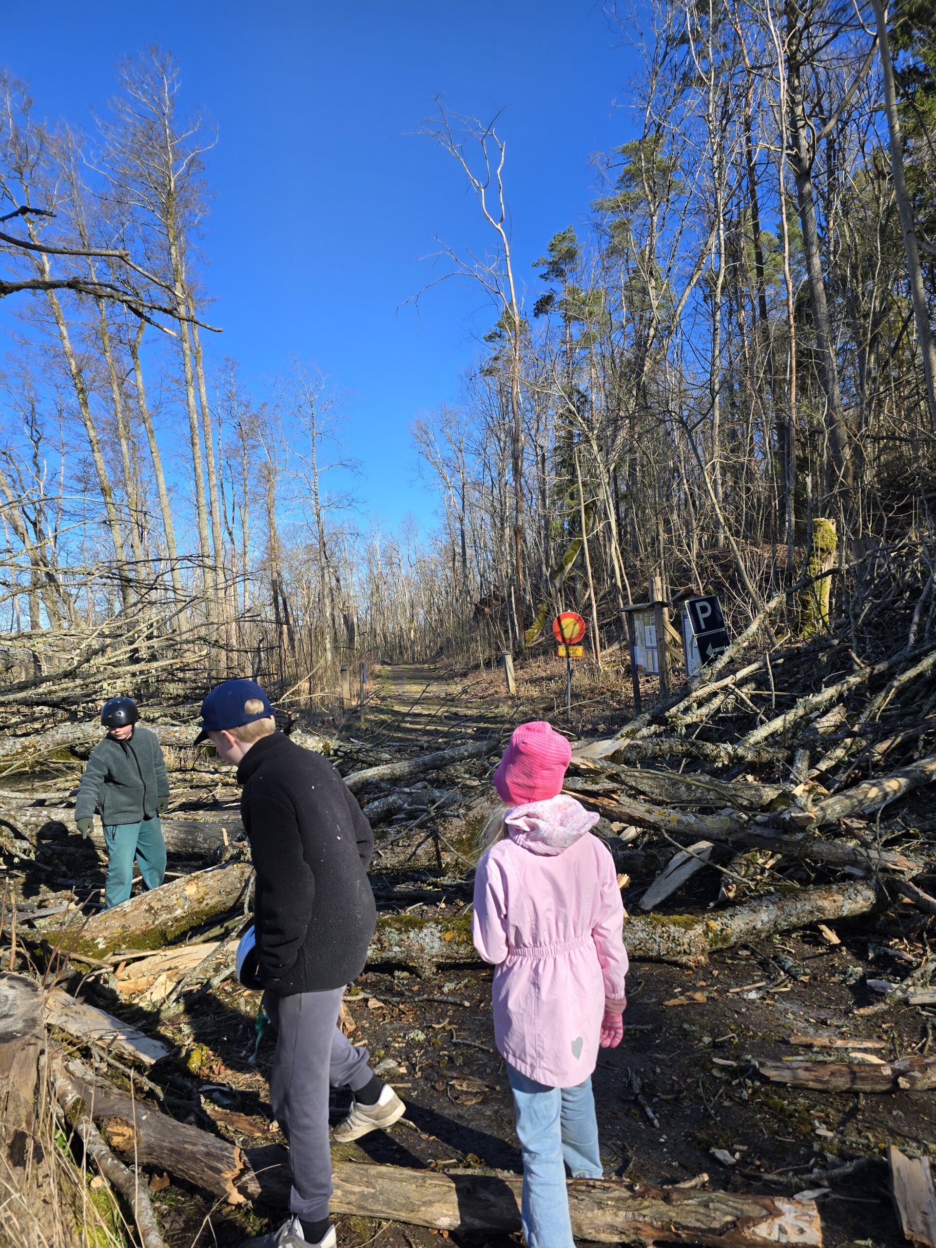Redan när vi kröp under det första trädet såg vi nästa, och det var betydligt större. När vi kom fram låg ett gigantiskt gammalt träd rakt över parkeringen, och staketet runt hade fått ge vika. Barnen såg det mest som en hinderbana och tog sig över utan att tveka, men för mig började en tanke ta form. Den här utflykten kanske inte skulle bli riktigt som jag hade tänkt.
