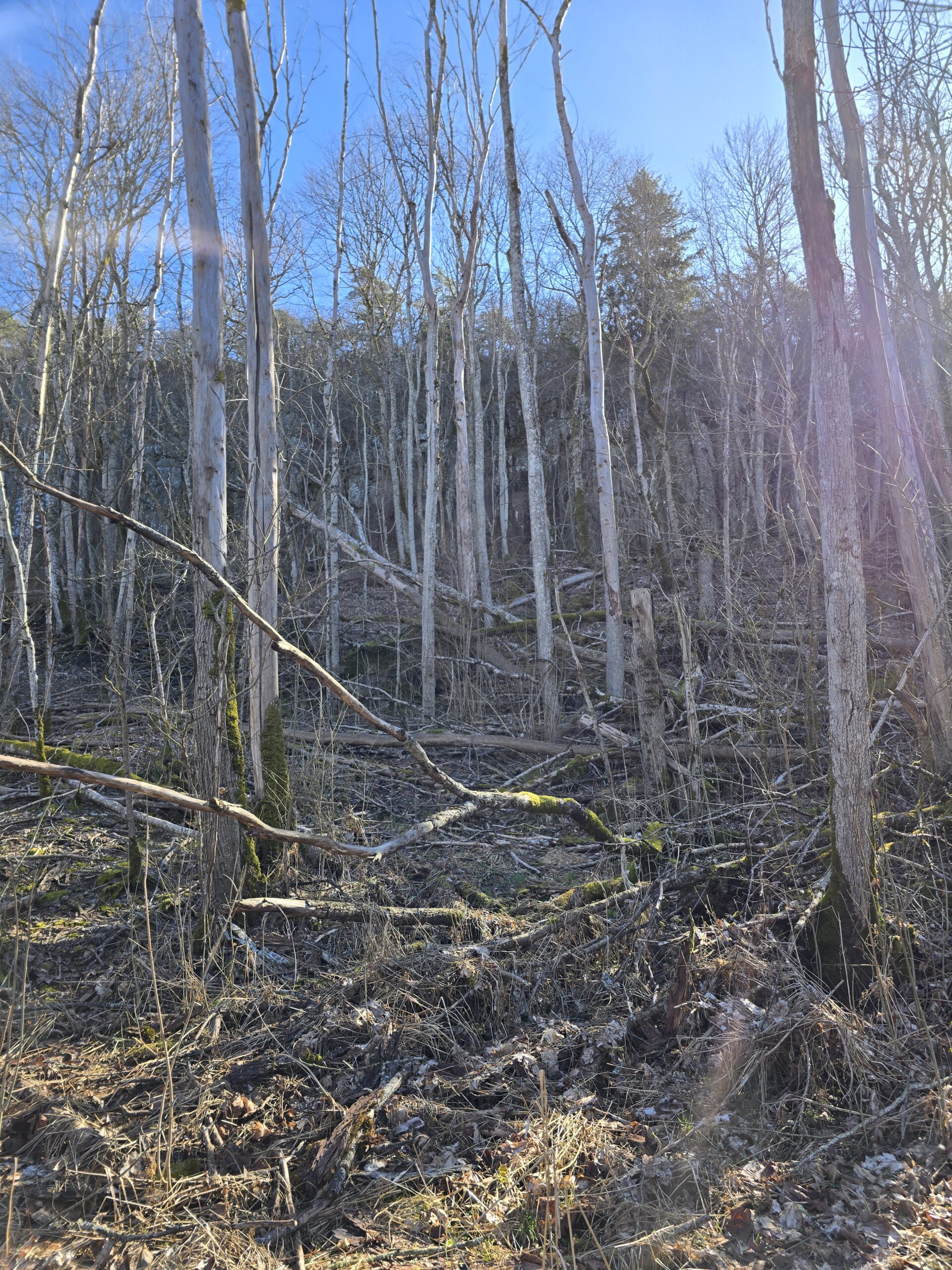 Efter en stund glesnade det bland de nedfallna träden, och jag såg en möjlighet att ta oss upp mot bergsbranten genom att slingra oss fram mellan stenar och träd. Barnen var inte sena att ge sig iväg uppåt bland fjolårets löv och skärvor av skiffer, och även om det är brant så är det inte särskilt långt.