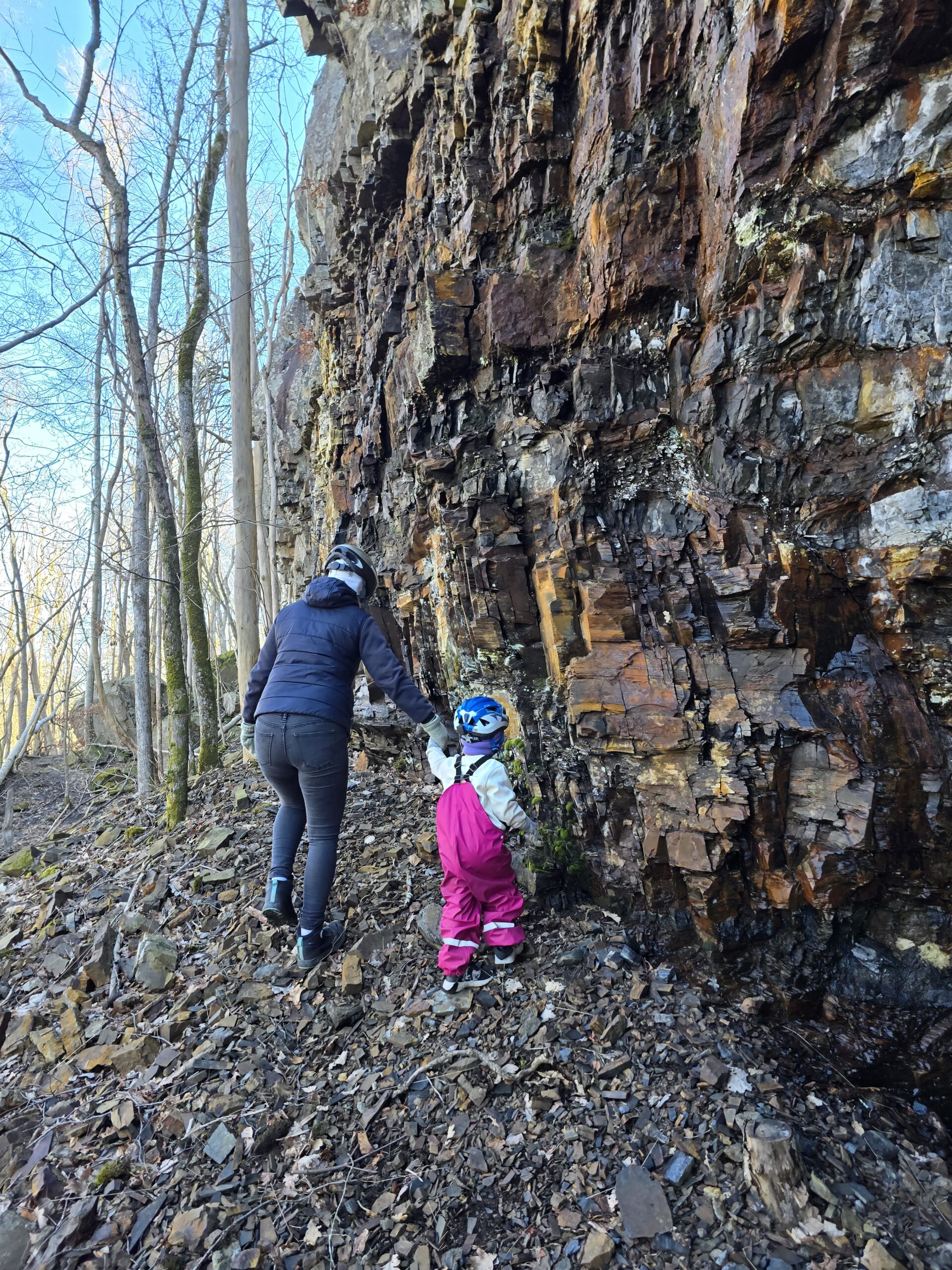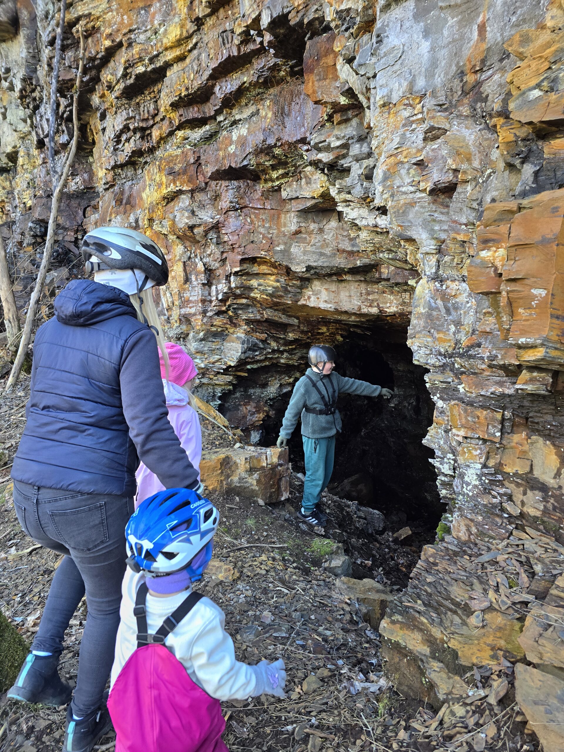 Som tur var fanns det plats att parkera vid korsningen. Vi stannade där och bildörrarna öppnades nästan samtidigt och ivriga barn klev ut åt alla håll. Tina och jag såg till att alla fick på sig jackor och mössor, och viktigast av allt, cykelhjälmar. Tanken var ju att vi skulle ta oss upp och titta in i gruvgångarna ovanför kyrkstigen.