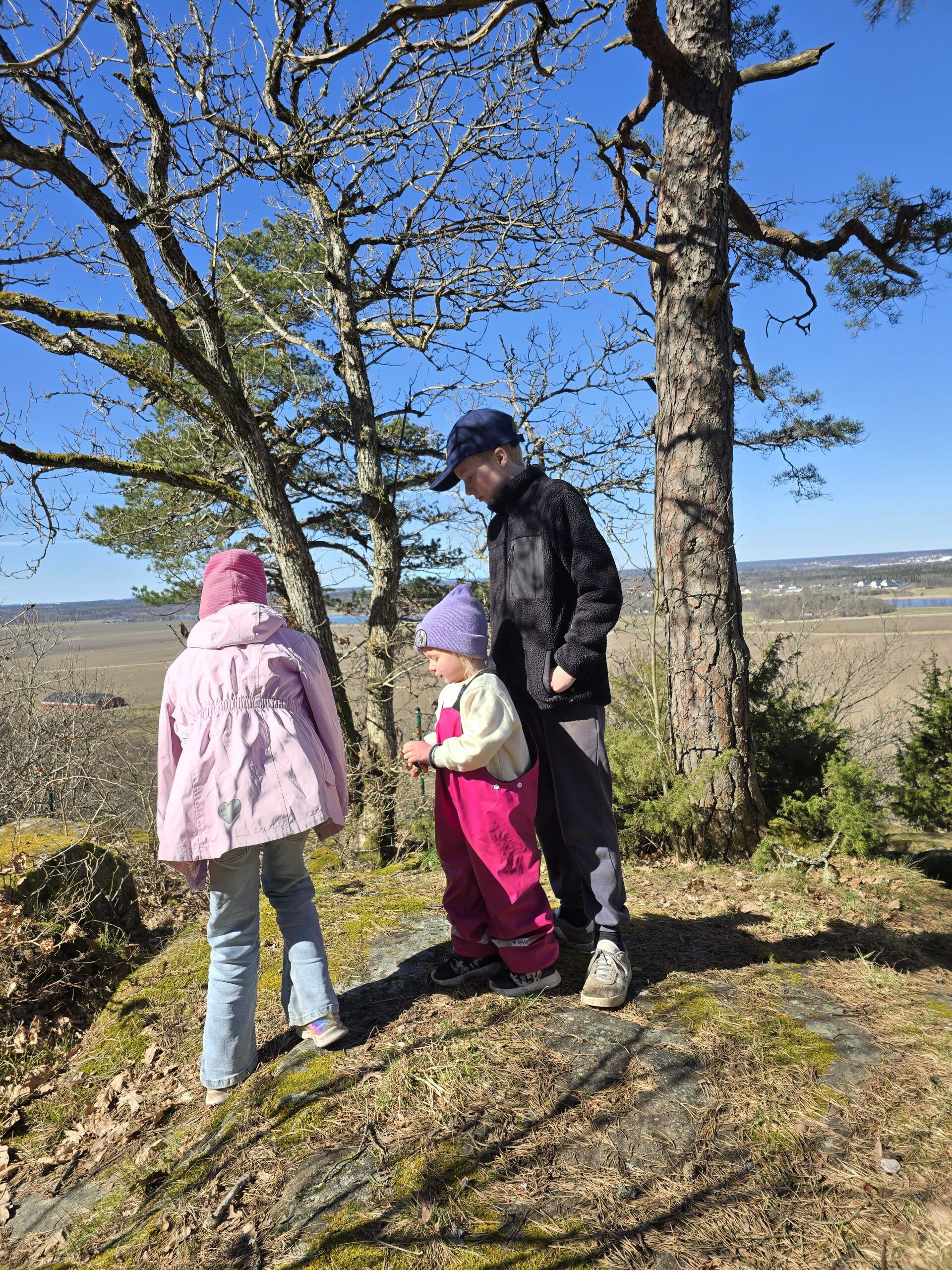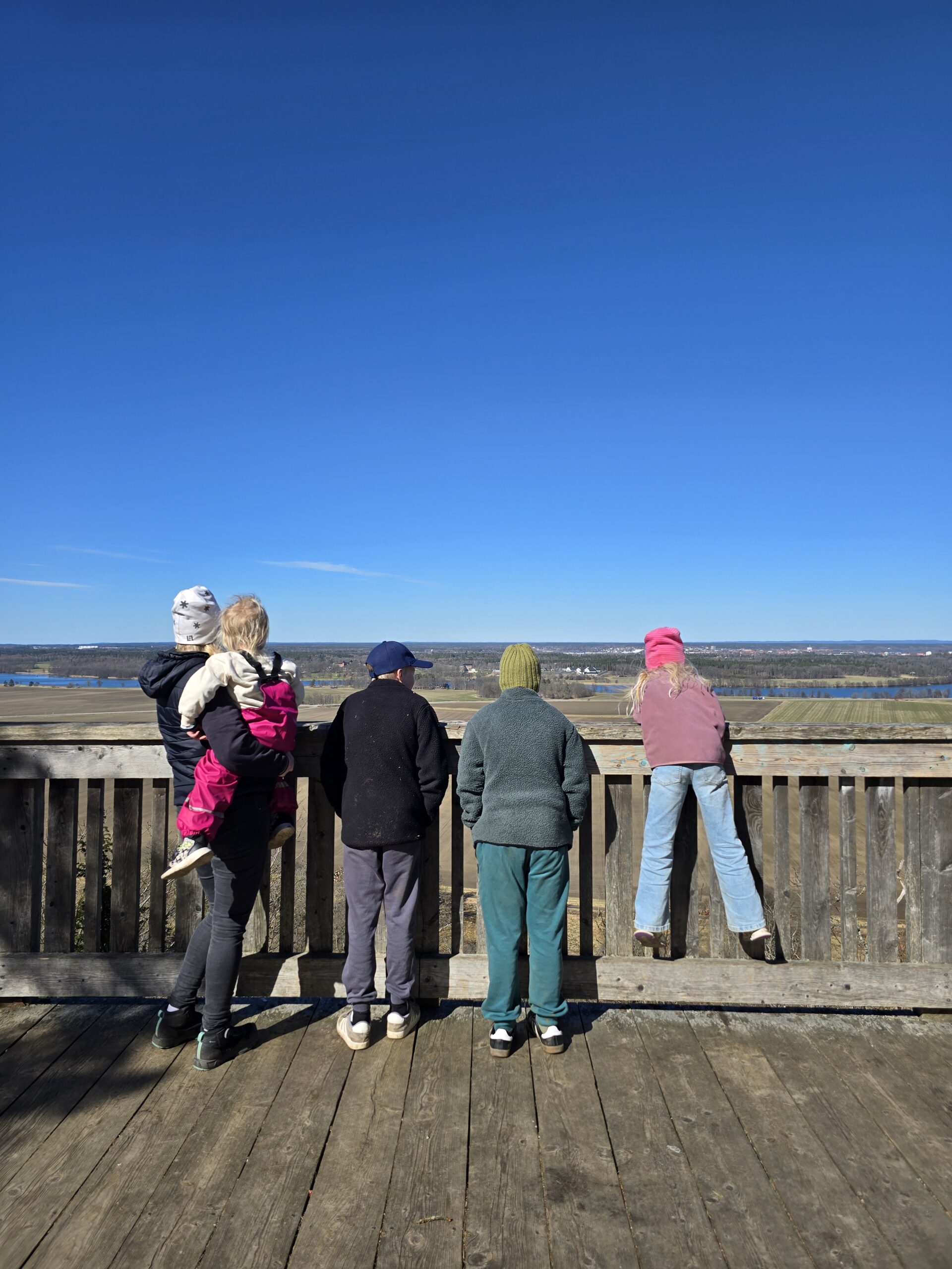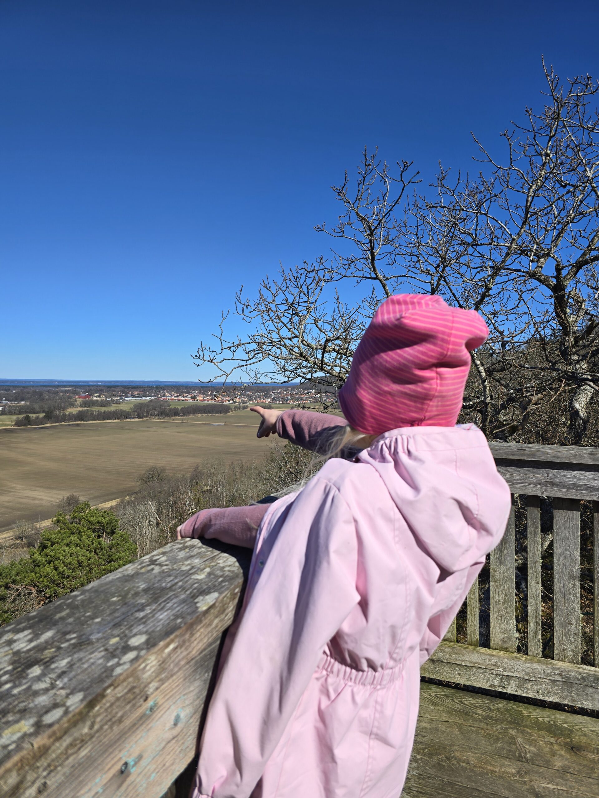 Därifrån hade vi utsikt över de västgötska slätterna och Göta älv som slingrar sig fram. Långt bort syntes en traktor, och ett av barnen utbrast: ”En sån liten traktor till allt detta”, samtidigt som hon gjorde en svepande gest med armen. Det märktes att hon funderade på hur allt hängde ihop där nere.