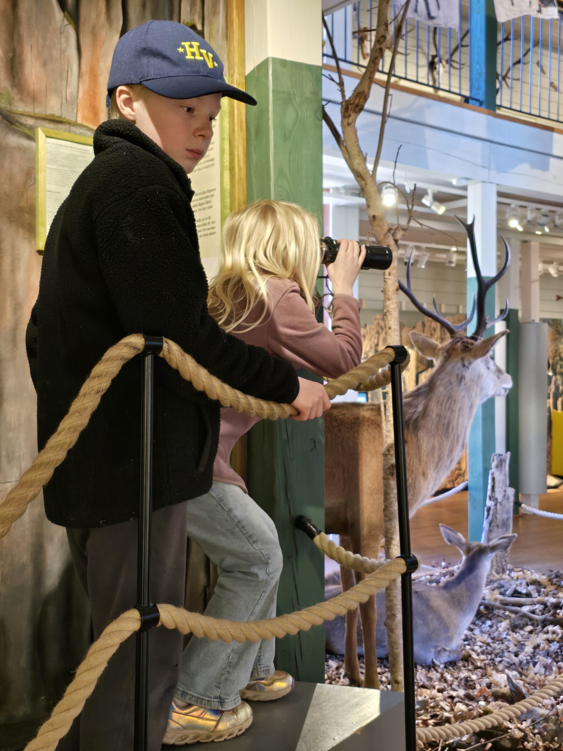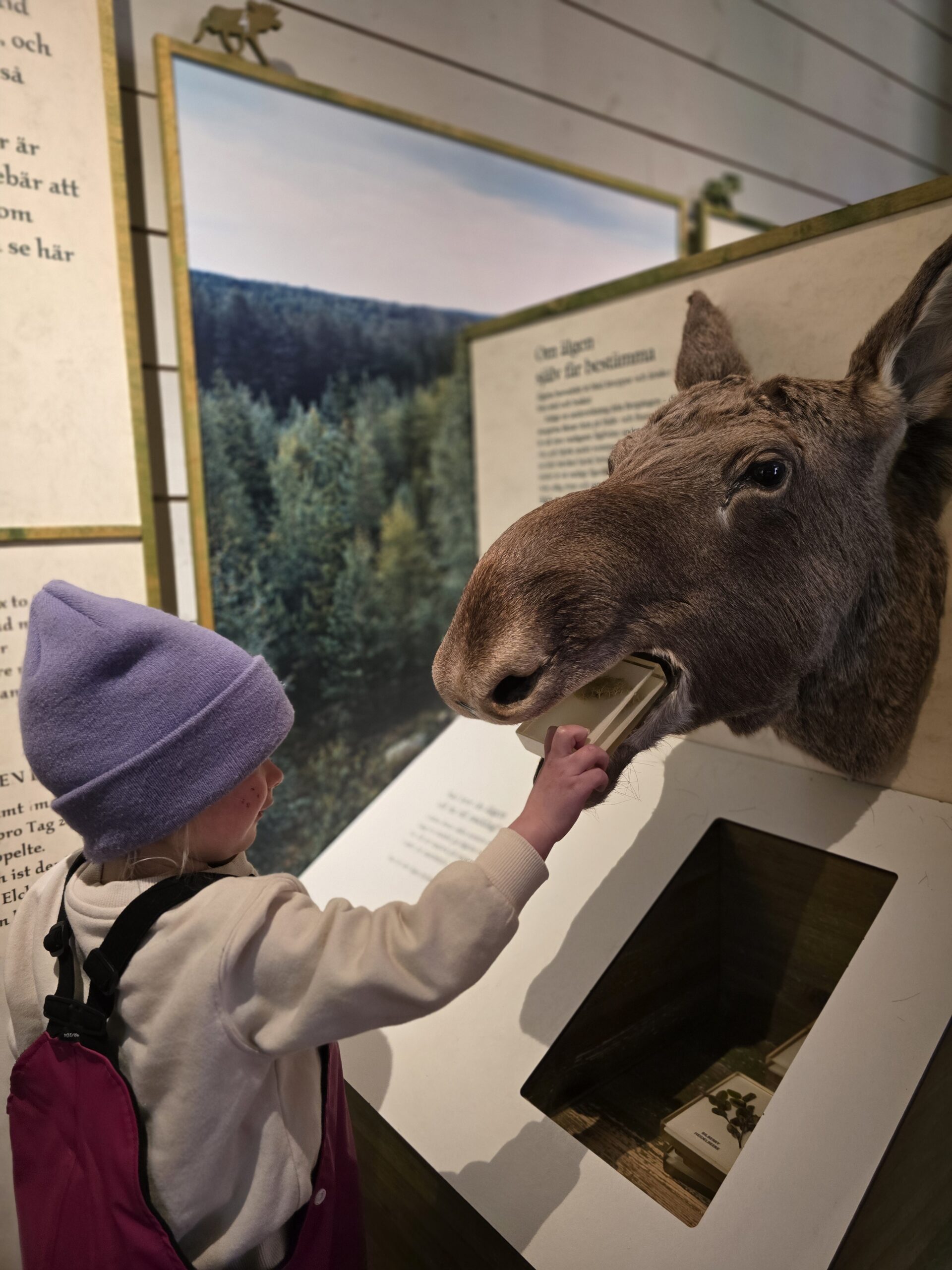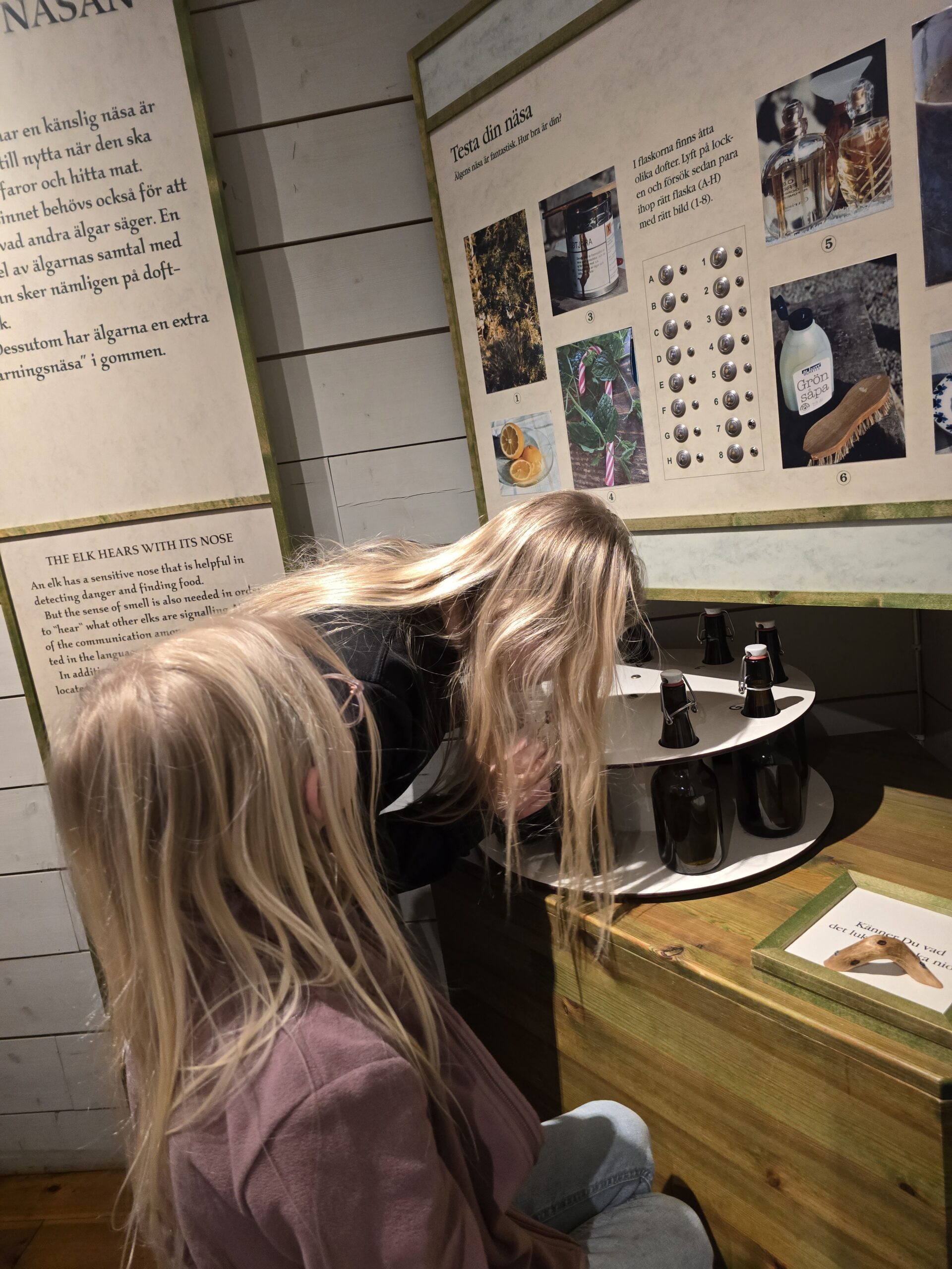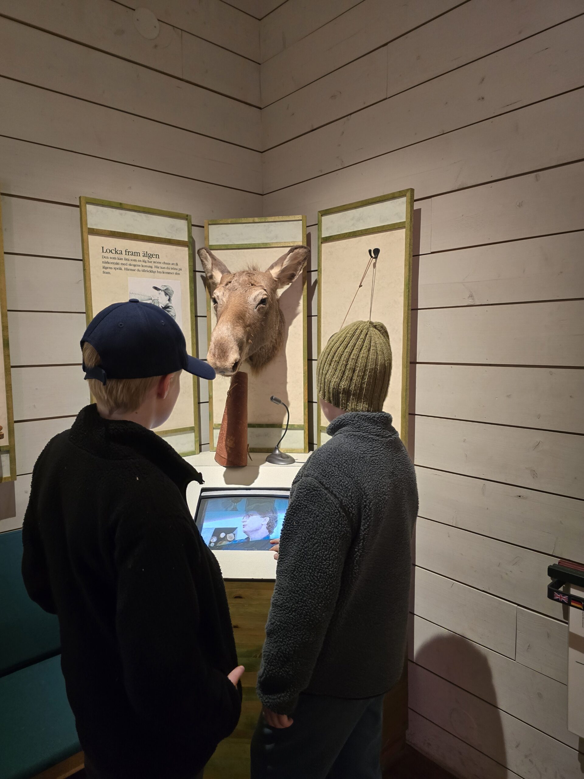 Redan i de första rummen fångades barnens uppmärksamhet. Det stack ut älghuvuden ur väggarna och vid flera stationer kunde man lyssna på hur älgar låter, testa sitt luktsinne och mata en älg med olika saker för att se vad den tyckte var blä eller mums. Vi gick vidare, men drogs tillbaka flera gånger.