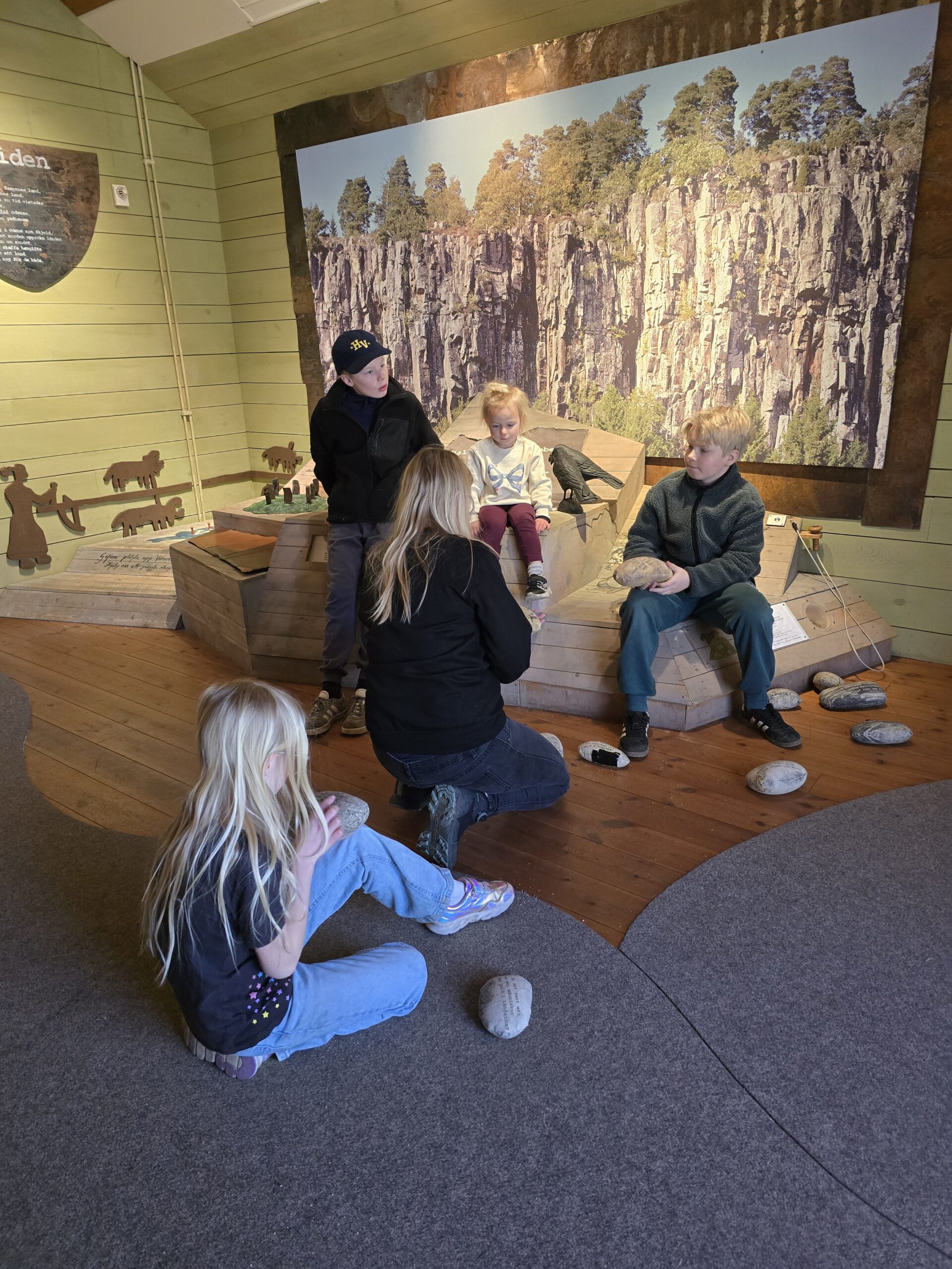 På ovanvåningen fanns en utställning om jakt och jakthistoria som inte engagerade det här gänget lika mycket, men innanför låg ett rum om geologi där vi stannade längre. Där fanns flera saker att göra, som att pussla Vänern, leta guld och läsa frågor på stora stenar. Riktigt skönt med en lugn plats efter allt ivrigt utforskande.
